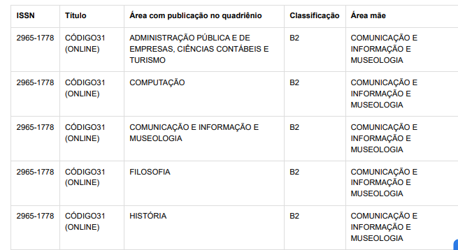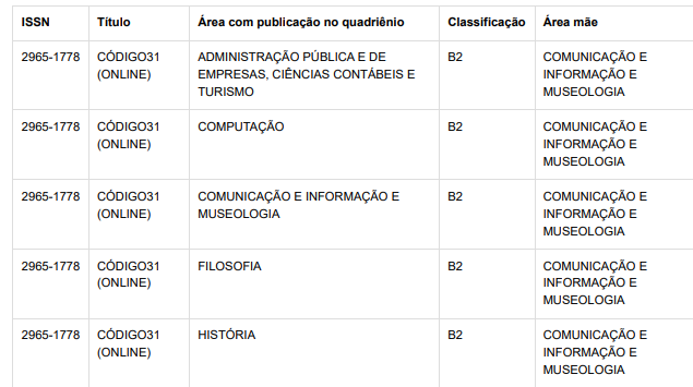 A Revista Código 31 é um periódico acadêmico interdisciplinar que abrange áreas como Comunicação e Informação e Museologia, Gestão do Conhecimento, Sistemas de Informação, Ciência da Computação, Inteligência Competitiva, Ciência de Dados, Governança da Informação, Política Informacional, Transformação Digital, Inovação, Inovação Social, Economia Criativa, Biblioteconomia, Arquivologia, Administração, História, Filosofia, Ontologia Aplicada e Ontologias Biomédicas. Comprometida com os padrões éticos na produção científica, a revista adota uma política de tolerância zero em relação ao plágio, seguindo as diretrizes do Committee on Publication Ethics (COPE). Com periodicidade semestral e aceitando submissões em fluxo contínuo, a Código 31 disponibiliza todo o seu conteúdo de forma gratuita e aberta, licenciada sob uma Licença Creative Commons Atribuição-NãoComercial-SemDerivações 4.0 Internacional.